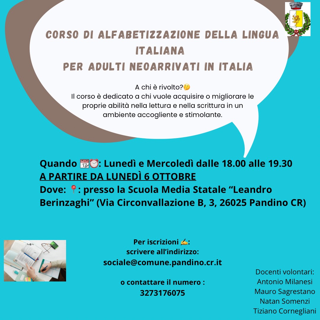 A partire dal Lunedì 6 Ottobre il lunedì e il mercoledì dalle 18.00 alle 19.30 presso la Scuola Media Statale "Leandro Berinzaghi" viene organizzato il corso di alfabetizzazione della lingua italiana per adulti neoarrivati in Italia
